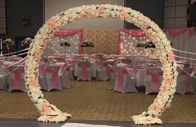 Arche ronde fleuri avec des panneaux de fleur couleur pastel.
